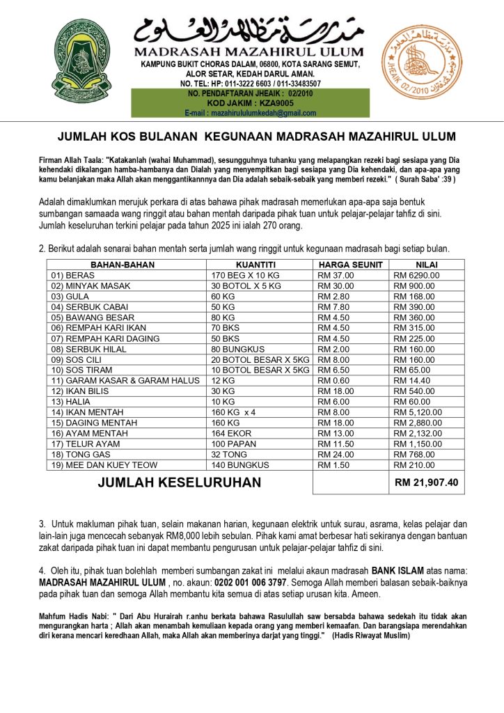 Dalam 34juta rakyat Malaysia harini, Alhamdulillah..Allah pilih Tuan/Puan untuk bersama-sama berkongsi rezeki dengan pelajar-pelajar dan warga madrsaah kami. Kami perlukan sumbangan Tuan/Puan untuk meneruskan pengajian kami disini.